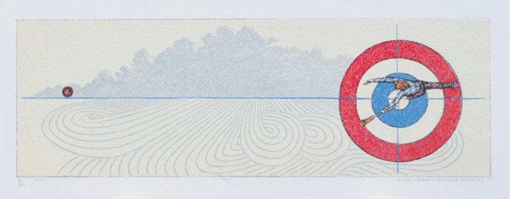 (L) Animal Unity, by Norval Morriseau (1932-2007); Morriseau, was an Indigenous Canadian Artist and the “Picasso” of the North”, His works depict the legends of his people, the cultural and political tensions between native Canadian and European traditions, his existential struggles, and his deep spirituality and mysticism; source, Wikipedia. (R) Graphite 1 by Don Proch; Proch made some of the most ambitious sculptures and installations of his time: where the land imprints itself on the body; where farm machinery, and the intractable harshness of the land are transmuted into myth; source, Border crossings